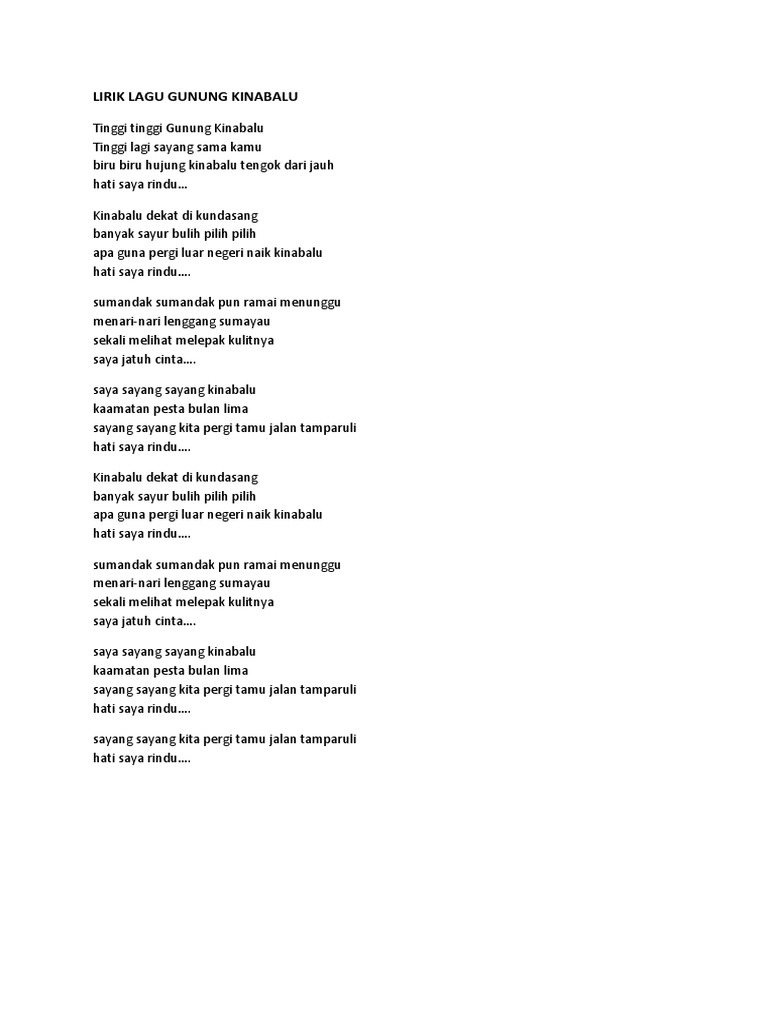 Lirik Lagu Ku Sayang Padamu -. Saya sayang sayang kinabalu kaamatan pesta bulan lima sayang sayang kita pergi tamu jalan tamparuli hati saya rindu. Kinabalu dekat di Kundasang Banyak sayur boleh pilih pilih Apa guna pergi luar negeri Naik Kinabalu.